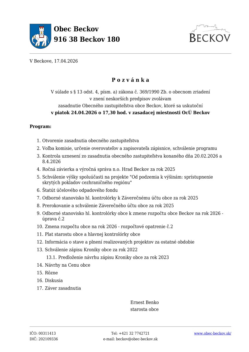 Pozvánka na zasadnutie obecného zastupiteľstva 24.04.2026